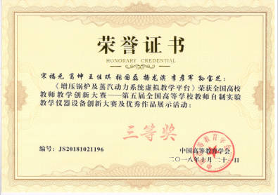 10月19至21日,“第五届全国高校教师自制实验教学仪器设备创新大赛及优秀作品展示”活动在成都举行。公司宋福元老师的实验教学软件类作品 《增压锅炉及蒸汽动力系统虚拟教学平台》荣获三等奖。
