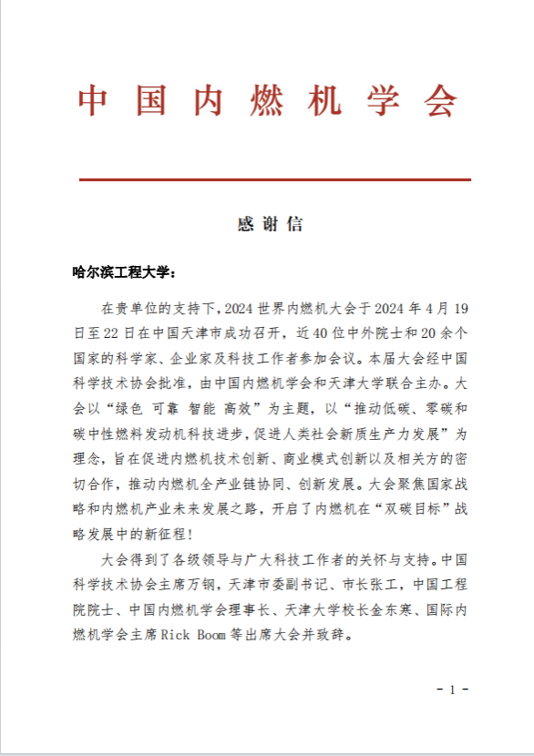 中国内燃机学会来信致谢!