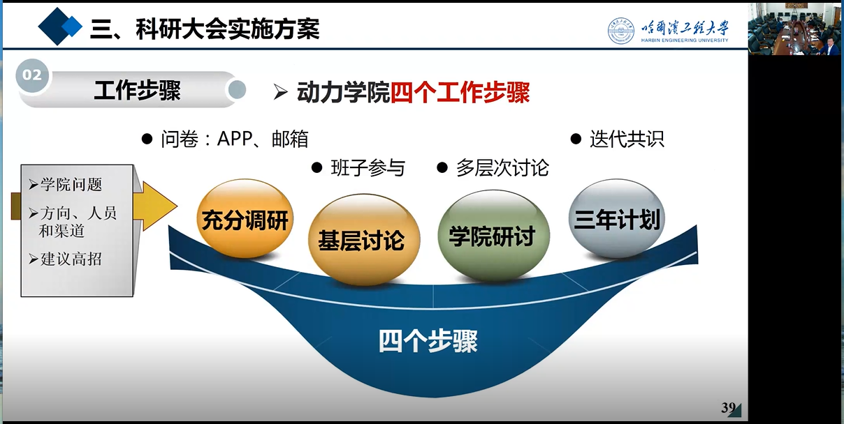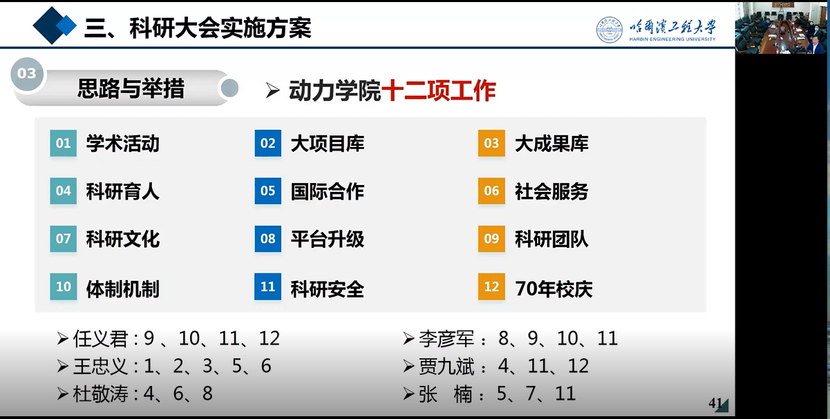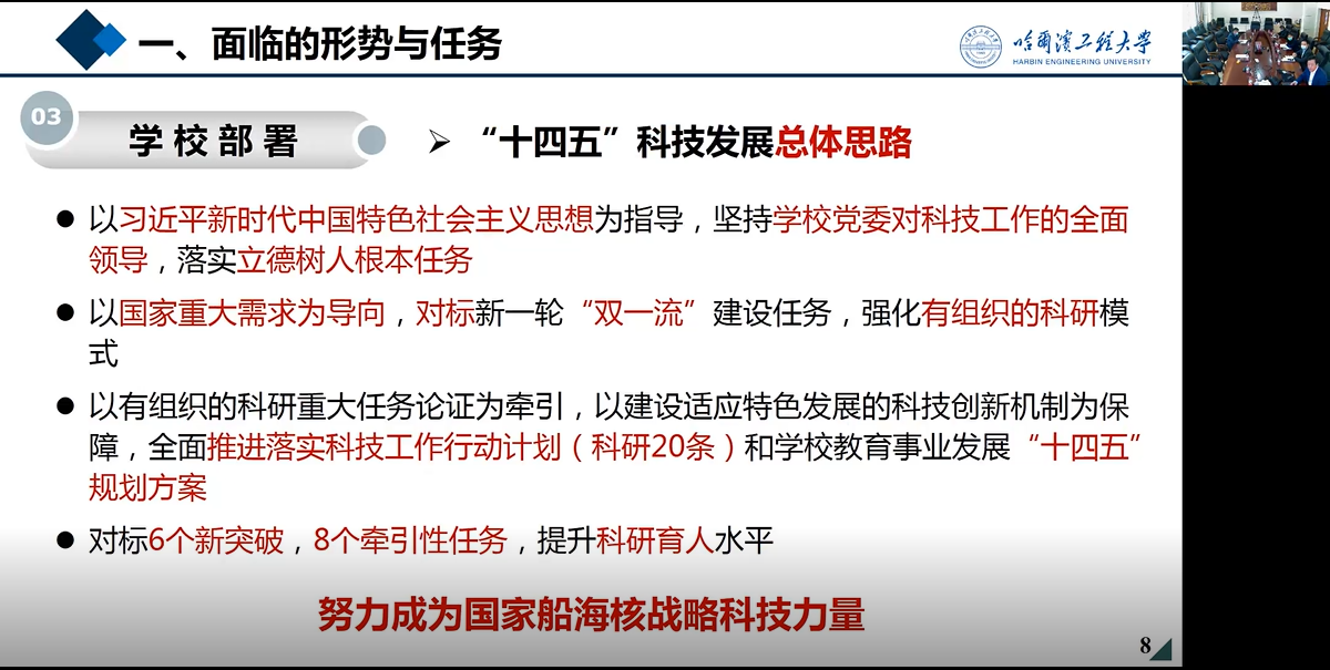 会上,李彦军经理围绕当前面临的形势与任务,公司的现状与不足,科研工作讨论会组织实施等3方面内容进行发言。全面介绍国际国内形势、国家方针政策、公司部署安排,重点阐述公司“十四五”科技发展总体思路及6个新突破,8项牵引性任务。系统回顾公司2021年取得的主要工作、存在差距不足。深入分析船舶动力领域面临的新的发展机遇,通过与国际国内、校际校内一流高校、一流学科对比,综合研判团队建设、科研工作面临的紧迫形势,内外部压力以及在前沿基础研究、自然基金重点项目,标志性成果、专利转化、国字号科研平台等方面存在的短板弱项,呼吁全体教师要增强忧患意识和紧迫感。详细介绍了公司科研讨论会具体安排,深入解读讨论会期间需开展的十二项重点工作,系统回答了本次讨论会是什么、为什么、干什么、要什么结果和谁来干、怎么干、啥标准、有什么业绩等大家普遍关注的8个问题。