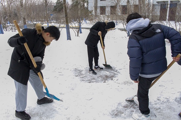 志愿者们在动力楼一号实验楼集合,对动力楼附近较滑的路段进行除冰。负责人分配任务,志愿者们做好保暖措施,带上铲雪工具,有序开展清雪活动。寒冷的天气抵挡不了同学们的积极性,大家认真的投入到活动当中,不畏严寒。志愿者之间分工明确,配合默契,用雪铲、铁锹清理积雪及冰面,将动力楼及动力实验楼门前主干道路清理干净。