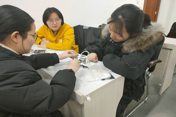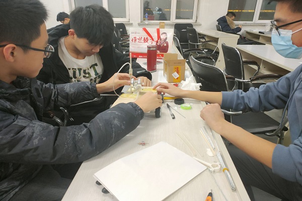 培训过程中,各个小组选择好本组的位置,并将零件与工具放置在本组选定的活动区域内。组内同学查阅资料并讨论可行的方案,选定方案后画出大致图纸,按照计划与图纸开始动手组装小车。小组成员相互配合,在组装过程中对不合适的部位进行调整,对小车的性能进行改进,为即将到来的比赛做准备。