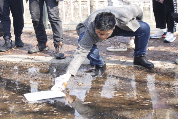 负责人梁宇琦号召志愿者们于图书馆前集合,共同前往马家沟沿岸。志愿者们自行分为五个小组,每个小组两人,相互配合共同协作,他们用捡到的塑料袋制成简易手套,在马家沟沿岸清理水中以及地上散落的垃圾,如塑料纸板、卫生纸等。清理完毕后,志愿者手提捡到的垃圾于马家沟沿岸合影留念。