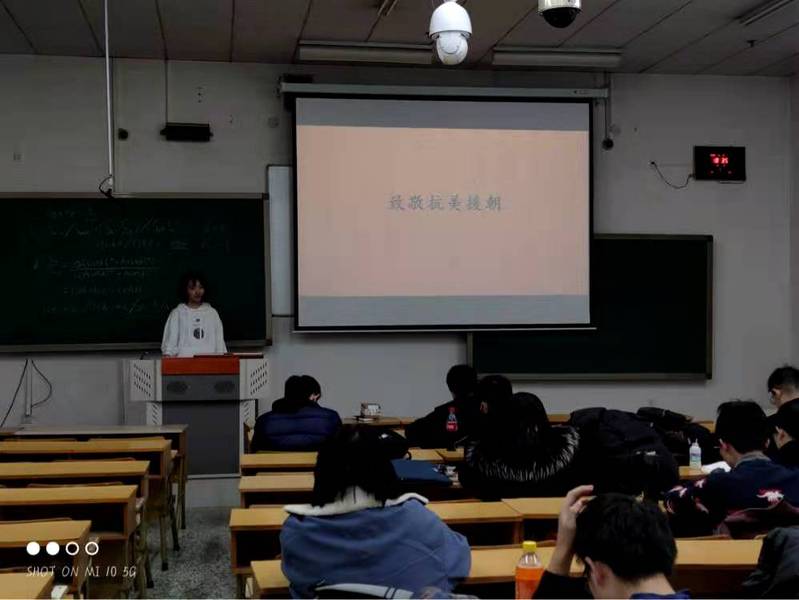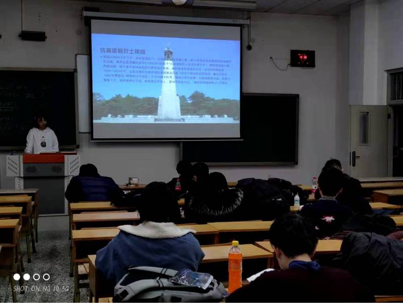 本次活动分为两个部分。首先由邓甜畑用PPT向同学们讲解志愿军入朝作战的背景以及先烈们的英勇壮举。然后是播放著名抗美援朝影片《上甘岭》,观影后,同学们体会到了志愿军战士一声令下跨过鸭绿江豪迈气魄和凭“山炮步枪”就就敢和联合国军“拼命干”的磅礴热血。