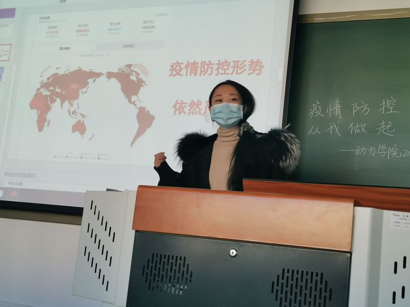 曹屹锋向同学们大致介绍了自年初武汉疫情爆发至今,中国乃至世界疫情的波动情况,得出了当前疫情形势依然严峻的结论。曹屹锋亲身示范,指导大家如何正确佩戴口罩。最后,曹屹锋邀请团支部成员李依珈上台为大家讲解新冠病毒的起源、种类及扩散情况。这也从科学的一面粉碎了“中国病毒论”。
