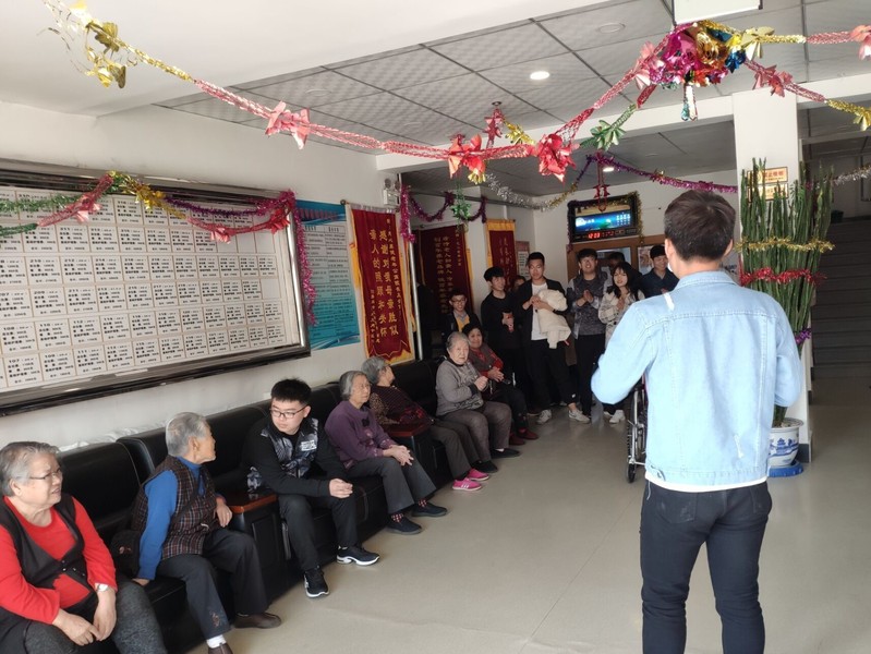 到达目的地后,支部成员首先将为老人准备的水果和糖分为三组给各个楼层的老人送去。接着支部成员尝试与老人聊天谈心,在聊天过程中有些老人年纪大了听不太清楚时,支部成员就给他们用表情动作来交流,同时部分支部成员还帮助老人清理垃圾,协助养老院的工作人员打扫楼道和老人住所的卫生。最后,团支部成员为老人们表演事先准备好的节目并与他们进行互动。