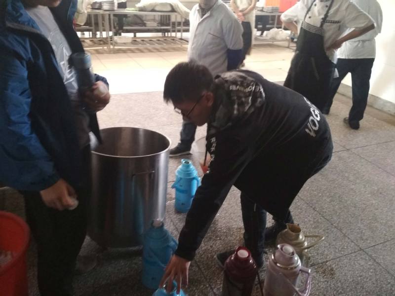 活动前支部成员与工地工人进行了交流,了解他们在公司的生活情况,工作情况,经过讨论将原定计划的早餐改为绿豆水,支部成员提前采购绿豆,冰糖,准备器皿,纸杯,与食堂联系制作。在炎热的天气,给中午下工的工人送来清凉。参观工地宿舍,在较安全的地方参观新建体育馆,体验施工条件的刻苦,为了更好的学习。