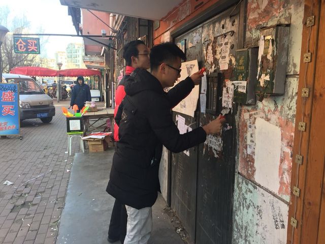 各位成员在到达后帮助居委会排列桌椅以及整理室内环境。清理小广告前,居委会成员对参加志愿活动的成员开展志愿者培训讲座,主要为大家讲解清理广告的方式与地点,并在讲座结束后发放清理工具与工作服。为提高效率,居委会将参加的16名同学分为4个小组,4组成员分别前往4个公寓楼道内进行广告清理。各成员使用喷雾器小铲子清理遍布楼道墙壁与扶手的小广告。下午3时整,广告清理完毕,志愿者合影留念。