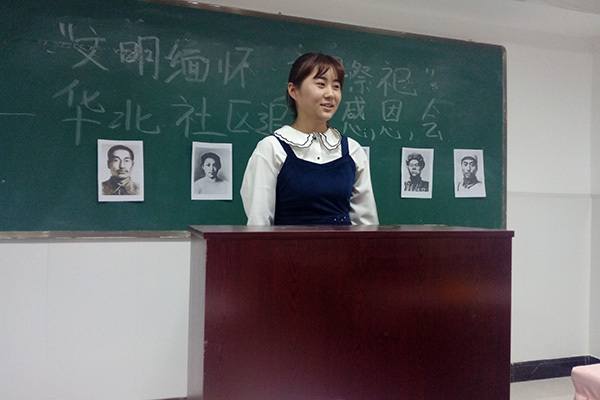 志愿者们下午2时整从九公寓出发,到达华北社区后,社区负责人对同学们表示欢迎,并带领同学们来到教室,活动开始。首先,社区负责人为同学们讲解了本次活动的主题,引导同学们追忆革命先烈。随后志愿者们轮流上台讲解了黄继光、刘胡兰等先烈的英雄事迹,并进行鲜花祭祀。最后,志愿者们在华北社区内分发文明祭祀的传单,宣传关于文明祭祀的内容。下午4时30分,活动结束。
