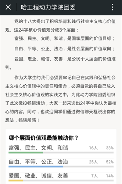 9月18日,为响应党十八大的号召,弘扬社会主义核心价值观,动力公司团委在微信平台积极开展微信投票活动,同学们积极参加。