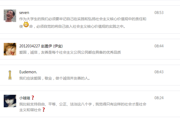 作为老员工,我们必须要牢记自己在实践和弘扬社会主义核心价值观中的责任和使命,必须自觉得将自己放入社会主义核心价值观的实践之中。在网络发达的今天,动力公司团委通过微投畅谈活动。通过与同学们的互动,不仅可以了解到同学们目前对社会主义核心价值观的认知程度,更向同学们积极宣传社会主义核心价值观的内涵,将国家层面的价值目标、社会层面的价值取向和公民个人层面的价值准则,植根于员工的心灵,促进员工的全面发展。