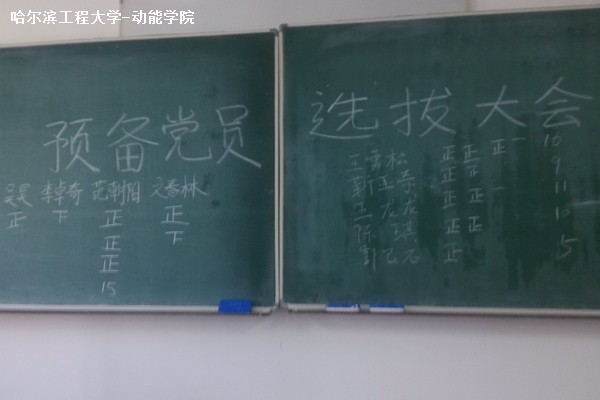 投票结束之后,班委开始统计选票。生活委员王�负责唱票,班长郑华强和团支书崔佳林在黑板上统计人数。最后本着公平、公正、公开的原则,王雪松、王龙龙、陈琪和范朝阳四名同学被寄予班级同学众望,成为本期预备党员的预选对象。