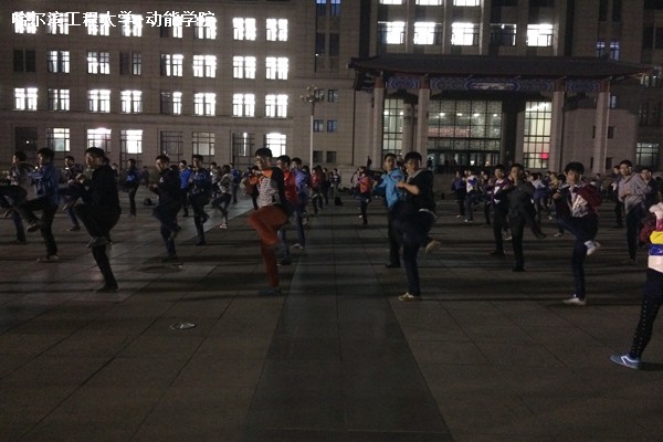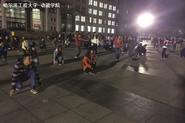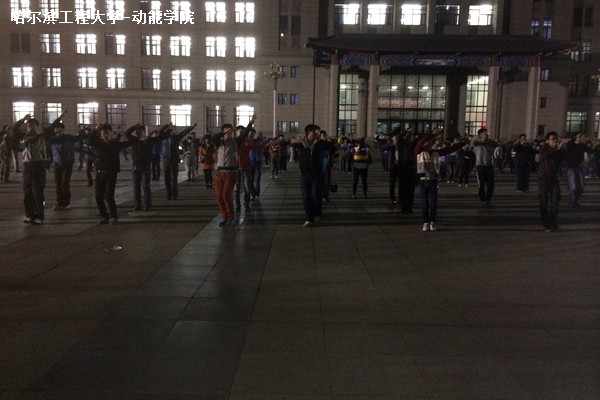 4月22日晚9时整,动力公司大一团体操成员在动力公司员工会文艺部成员的带领下,于奥列霍夫广场进行团体操训练。