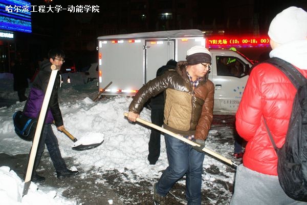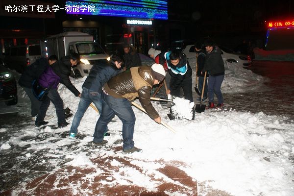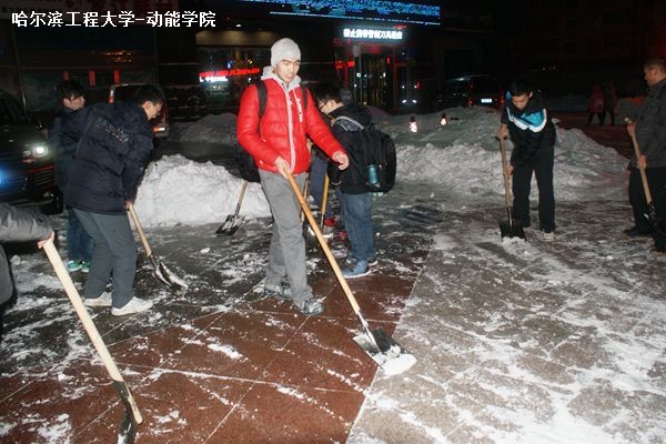 20日下午,同学们提前来到动力楼,取了铁锹、扫帚等清扫工具,随后便来到社区指定地点清除道路上的积雪。清雪工作在下午4点开始,尽管同学们的手和脸都冻得通红,但是这丝毫没有影响同学们的热情和工作效率。