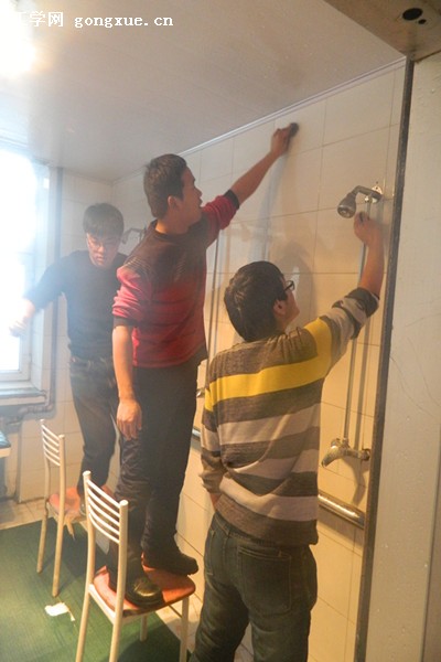 作为老人们集体的住所,公寓卫生无疑是老人们生活中最重要的环节之一。为此,在和谭阿姨寒暄之后,团支书许文良开始组织同学们进行全面清扫公寓澡堂这一定期性卫生整顿工作。九名同学各自分工,从澡堂墙面清理到地面清洗再到洗具的整理和清洗,同学们充分发挥集体的智慧和劳动力,体现了作为军工人耐劳肯干的优秀精神品质。整个清扫过程历时两个小时,最后谭阿姨对于同学们的工作表现给予了充分的肯定。