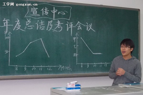 记者团工作由宣传中心副主任、记者团团长陈国强进行总结。首先他作了两幅折线图,主题分别是本学期投稿量和公司网站等级情况。从图中可以看出,投稿量从9月份开始逐月上升,其中11月份达到了将近90篇。他对大家的工作表示肯定,感谢大家这学期付出的努力,同时也指出了这学期工作中存在的问题:由于上传新闻的时候照片没有居中,导致公司网站在校级评比中没有取得理想的成绩。之后记者团部长吴江飞也进行了总结,并表达了自己对大家将来工作的期望。