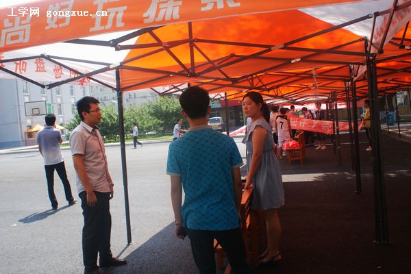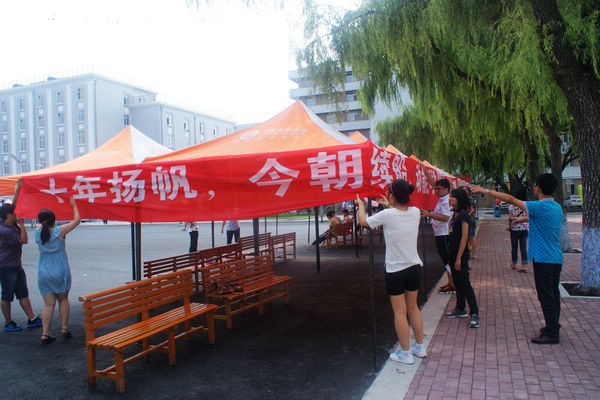 从二公寓领取了迎新的工作帐篷和工具之后,大家共同努力很快把四顶帐篷撑好。在现场大家还把欢迎新生的标语挂上,“xcsports”的标语则挂在醒目的位置。之后,又在现场摆好桌椅。现场被分为的报到处和新生家长休息区。新生报到那天新生先是在报到处报到和领取资料,新生家长休息区则是用来给员工家长休息只用。至此,动力公司的迎新场地布置基本完成。