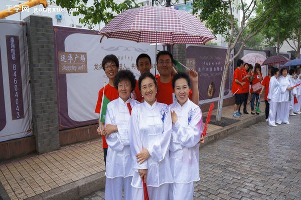 四点开始彩排,在这个街区,是哈市体育局组织的400人的太极扇表演,叔叔阿姨们虽都上了岁数,却都精神抖擞地进行最后的彩排:整齐的动作,时缓时急的节奏,有力的目光,在扇子整齐张开的瞬间借助那震撼的声响将新时代老年人的精气神表现的淋漓尽致,在场所有的志愿者还有过往的行人不由鼓起掌。在彩排一轮后,天空飘起了雨点,雨越下越大,可是叔叔阿姨们却没有赶去避雨,而是站在那里等待指挥。同学们见此景,纷纷撑起手里的伞,上前给叔叔阿姨们打伞,同学们知道这是不服从组织安排的行为,可是大家更明白志愿者的意义所在――服务他人,快乐自己。街对面外校的志愿者也被我们带动起来,纷纷前去和叔叔阿姨共撑一把伞,雨中,多彩的雨伞、伞下红色志愿者服和白色武术服形成了一道独特的风景线,行人们鼓励的笑容让同学们感受到志愿者的快乐。