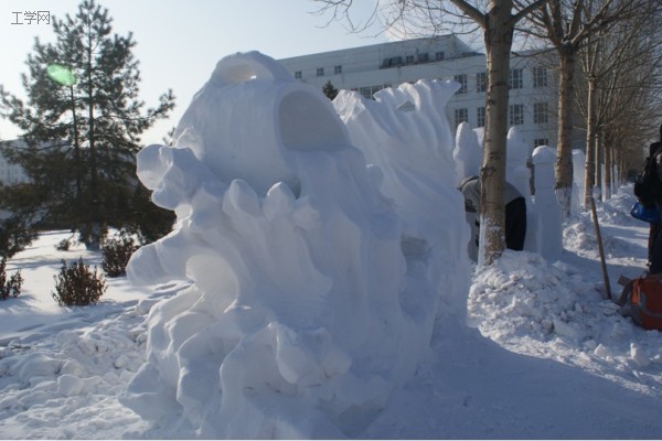 第二天中午又去拍照,白天那里的人多了一些,也可能是最后一天的原因,大家都想自己的作品能够完美,所以看到了不少挥舞着小铲子、小刀子的同学们。完成一个作品要多久,“似水流年”作品的作者们告诉了我答案,把所有的时间都加起来大约要一天,就是说至少要24个小时要在冰天雪地里呆着,有时候实在冷得受不了了就跑到旁边的楼里去缓一缓,或者接一杯热水捂在手里。在这样的寒冷中没有几个人可以逃脱感冒的侵袭,几乎组里的所有成员都不同程度的感冒,嗓子沙哑了。完成一个雪雕作品真的很难,除了天气原因外,有时候工具不够,只能到处去借,雕的时候雪还会落进袖子里,非常难受。但就算这样,也挡不住大家心中的热情,没有一个会退缩,就算是生病了也只是暂时的休息一下,没等病好又投入了雕刻中。完成一件作品是非常值得高兴的,就像父母看着自己的孩子长大一样,那种欣喜和欣慰之情是无以言表的。