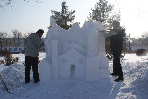 成功的作品必定由辛勤的汗水浇筑而成,在如此寒冷的冬季,四周都是厚厚的白雪,他们顶着凛冽的寒风,一点一点打造心中的城堡。我亲眼看到他们的手套上都结了厚厚的冰,却还是不停歇的雕琢细刻,任风雪将衣衫都打透。