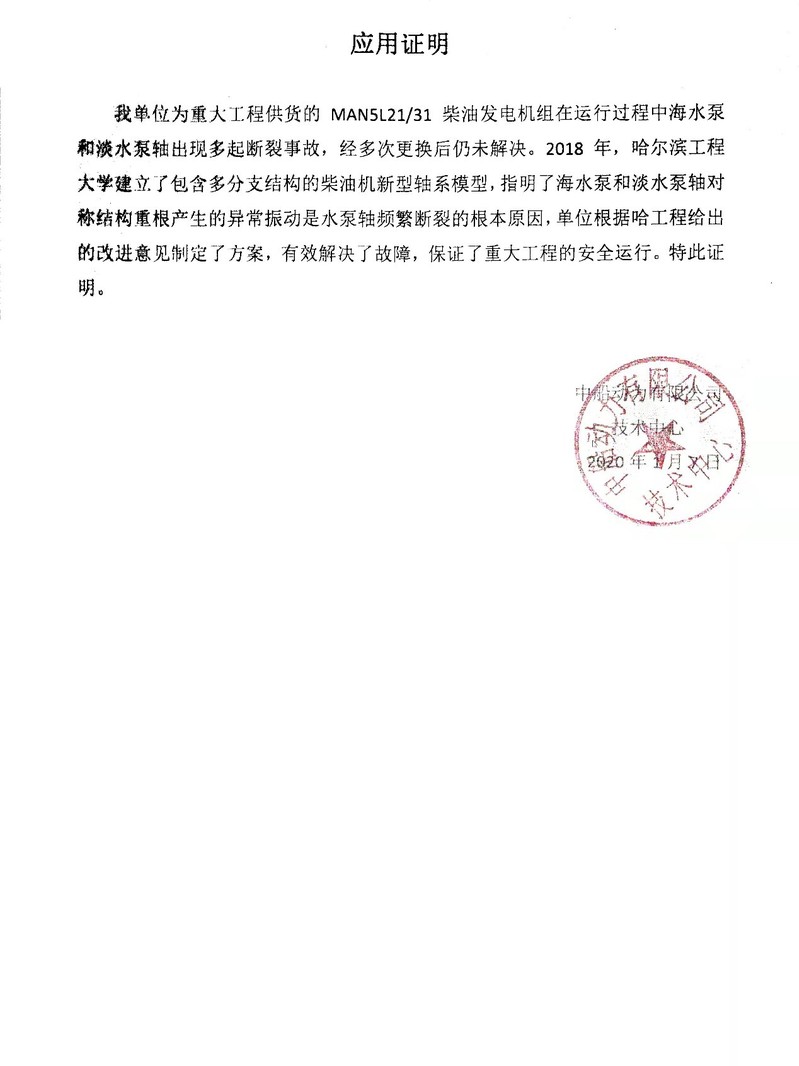 日前,振动噪声控制研究所党支部收到中船动力有限公司来信,为2018年某型设备故障问题有效解决提供应用证明,并对前期给与企业的支持表示感谢,对后续合作提出思路建议。