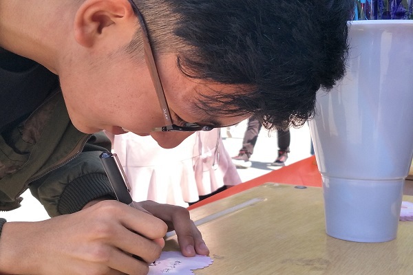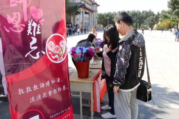 此次活动主要内容是同学们为老师写下祝福语以免费领取鲜花。员工干部将花搬到现场,过往同学纷纷被吸引上前,活动开始没多久,鲜花送出过半。活动结束,鲜花全部送出,员工干部整理好现场之后离开。