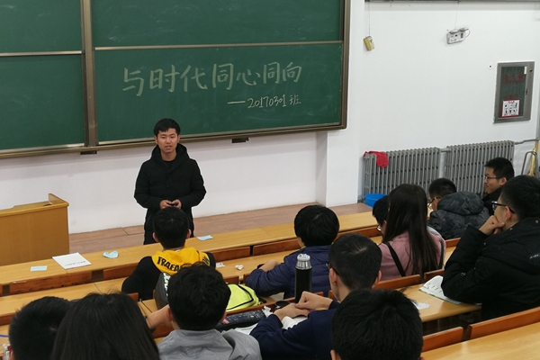 此次“与时代同心同向”主题团日活动分为主持人介绍活动内容,回顾十九大内容,分析十九大精神,结合自身畅聊感悟四个方面,分四个阶段开展。首先是主持人介绍活动主要内容和流程,全体成员在规定时间到齐后,团活正式开始。团日活动的第二项是集体回忆十九大内容,支持人展示之前精心准备的相关资料,同学们回顾了习近平新时代中国特色社会主义思想,并进行适当讨论。团日活动的第三项内容是分析十九大精神,同学们对十九大精神与两会之间的联系展开讨论,相互交流,支部成员积极参与并对习近平新时代中国特色社会主义思想和党的十九大精神有深刻的了解认识。团日活动的最后一项是支部成员结合自己的亲身经历,阐述自己对于十九大精神的感悟。每个人都从自身情况出发进行了发言,气氛一度活跃。