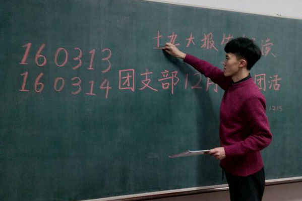 12月4日21时20分,20160314及20160313团支部于21B304教室开展以“解读十九大报告”为主题的团日活动,20160314及20160313团支部全体成员参加此次活动。