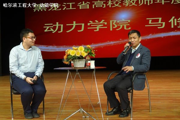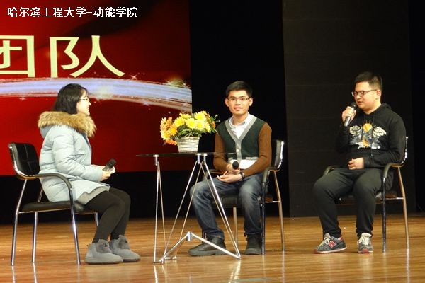 在一段音乐中同学们陆续进场,在工作人员的指引下就位。首先,主持人请动力公司经理马修真教授上台进行访谈,员工代表为经理佩戴胸章并握手合影。马经理讲述他自己求学时的经历与生活情况,并表示如今的学习条件是多么优秀,希望同学们珍惜现在,努力学习。此外,马经理还根据主持人提供的照片,讲述哈军工时期的故事,描述哈军工时期的辉煌。马经理指出,当年哈军工是一个能与清华北大并肩的公司,并向往着如今的哈工程可以以军工为目标不断发展。最后,针对哈工程 “最憋屈大学”的称呼,马经理详细列举公司为国防建设和海洋强国做出的杰出贡献,以及国家政策对公司的支持,鼓励员工们树立坚定的信心。