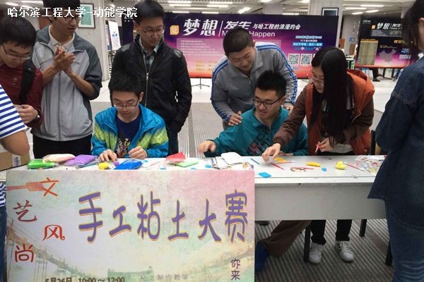 10时整,312班的同学们在启航大厅中将场地布置完毕后,此次活动正式开始。同学们在选择好所需的各色粘土和工具后便各自开始制作自己的作品,有遇到困难的,便向几位心灵手巧的女生寻求帮助,一起解决制作中遇到的问题。随着活动的进行,逐渐有路过的同学,外国职工,甚至是老师上前询问并加入到粘土作品的制作中来。对于一些手不是很灵巧或是没有经验的人,会由312班一些有经验的同学们给予指导,帮助他们完成作品。中午12时整,团活正式结束,在收拾完场地后,312班的同学们便有序的离开了。活动的两个小时中,同学们完成了许多优秀的作品,有像捣蛋猪,龙猫之类可爱的,也有像宇宙飞船一样霸气的,全都惟妙惟肖。