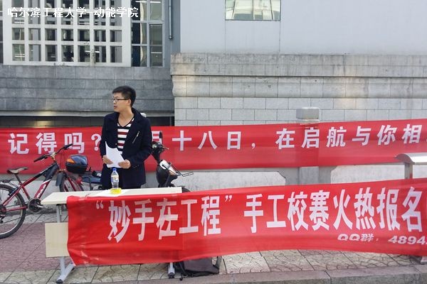 报名活动现场,手工社精心布置场地并准备宣传本次比赛。手工社在老员工美食广场和老员工美食城各个门口安排人员发布宣传单,并鼓励同学们参加本次比赛。手工社在老员工美食广场和老员工美食城设立报名点。本次比赛分为种不同的形式,既可以提前做完参加比赛同时也可以在比赛过程中限时完成,在工作人员的鼓励下,同学们都积极报名参加本次比赛。在持续两天的报名过程中,同学们对本次比赛的兴趣颇深,并表示希望得到名次和奖品。
