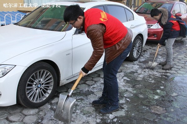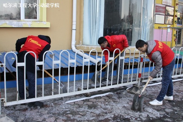 在对扫雪区域进行简单地规划后,志愿者们纷纷行动起来,手拿铁锹、扫帚等工具对社区地面上的积雪进行清理。志愿者们用铁锨一点一点地铲掉硬冰和积雪,然后用铁锹将它们运到路旁。整个活动过程中,铁锹与地面的撞击声不绝于耳,路面上的冰层和雪层也一点点被敲碎。尽管同学们的手和脸都冻得通红,但是这丝毫没有影响同学们的热情和工作效率。